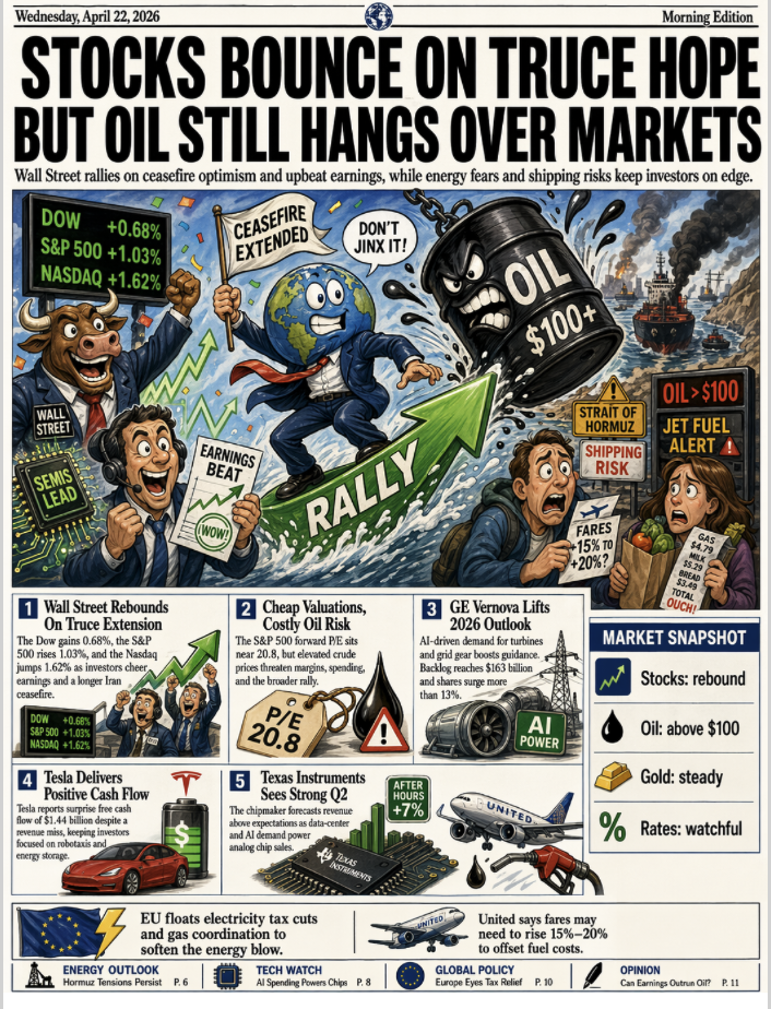 2026년 4월 22일 미국 증시 마감 — S&P·나스닥 신고가, 브렌트 100달러 재돌파 "주식은 웃고, 유가는 경고했다"